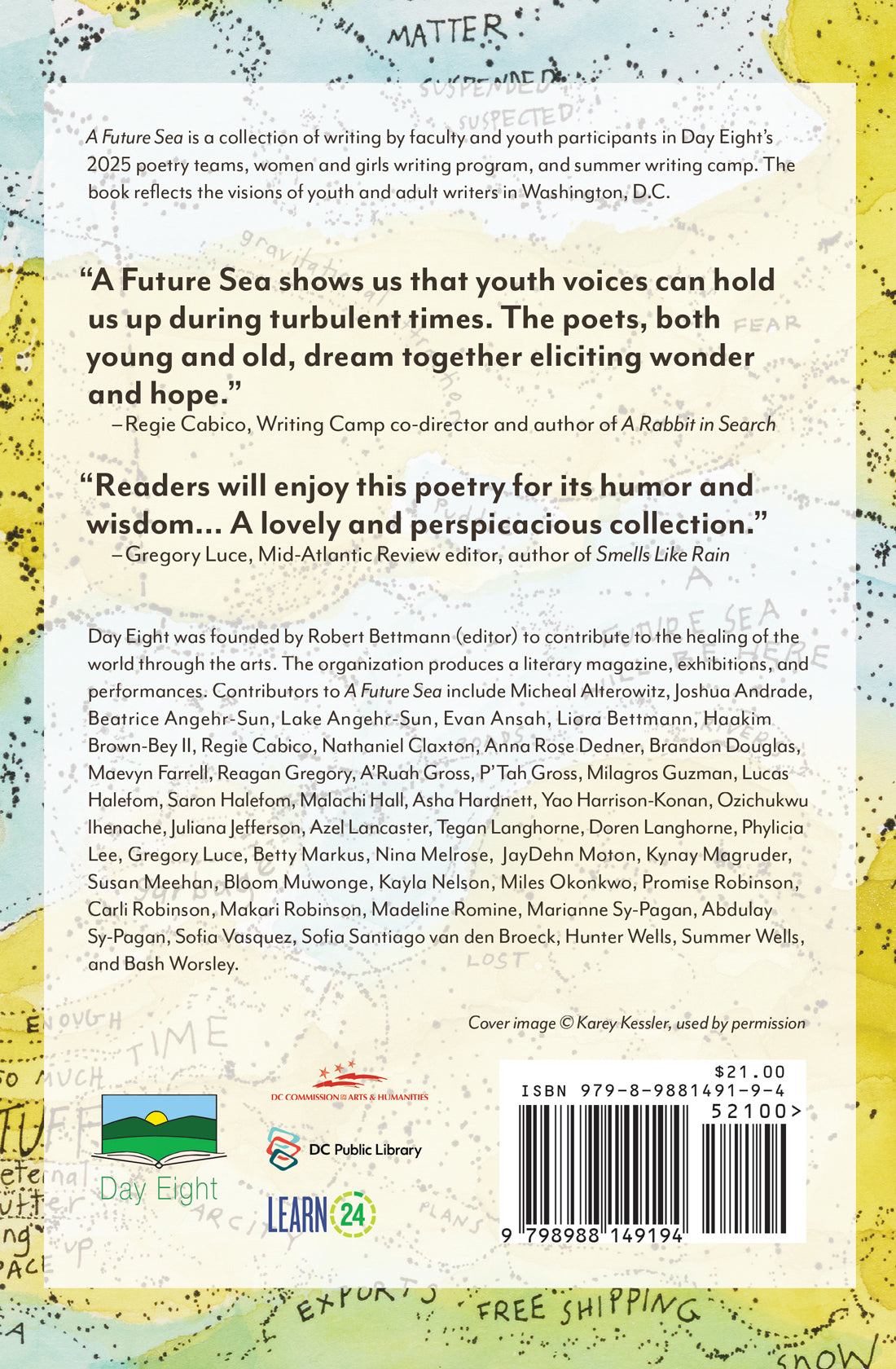 Day Eight was founded by Robert Bettmann (editor) to contribute to the healing of the world through the arts. The organization produces a literary magazine, exhibitions, and performances. Publication of A Future Sea was made possibly be individual donors to Day Eight and grants from Learn24, Anc4a, the DC Commission on the Arts and Humanities, and the Friends of the Shepherd Park Library.